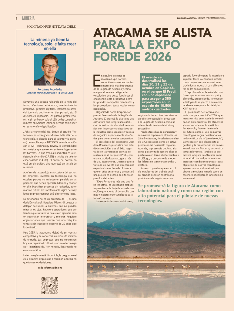 “Expo Forede es la señal de confianza que Atacama envía al país y al mundo, proponiendo, innovando y dialogando respecto a la minería moderna y responsable del siglo XXI”, resalta.